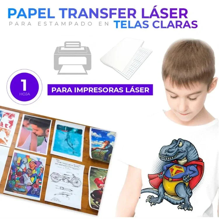 Papel Transfer Láser A3 para telas claras. Transferencia precisa, impresiones duraderas, Personalizacion de Ropa, Mochilas, Poleras, Polos, Bolsos,Jockey