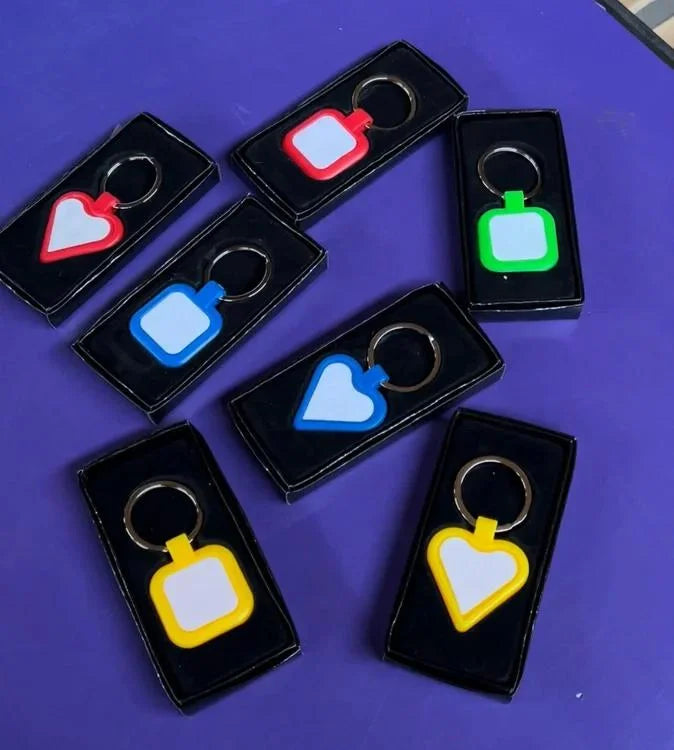 Explora nuestros llaveros plásticos con lámina sublimable por ambos lados, disponibles en divertidos modelos de corazón y cuadrado. Estos llaveros vienen en colores vibrantes: amarillo, rojo, azul y verde, y cada uno incluye una cajita individual de color negro, perfecta para presentaciones y regalos.