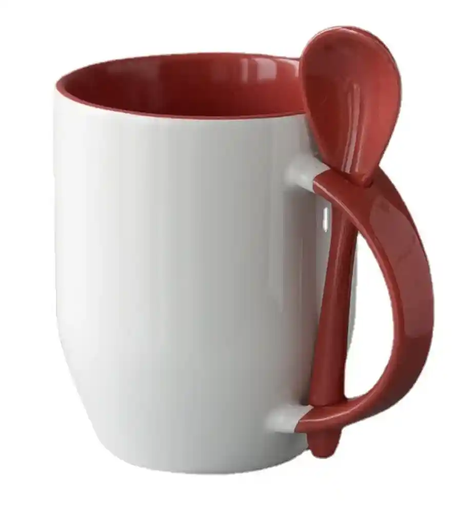 Tazón sublimable de 12oz con cuchara interior y asa de color Rojo. Perfecto para personalización y regalos únicos. Ideal para sublimación y estampado de alta calidad.