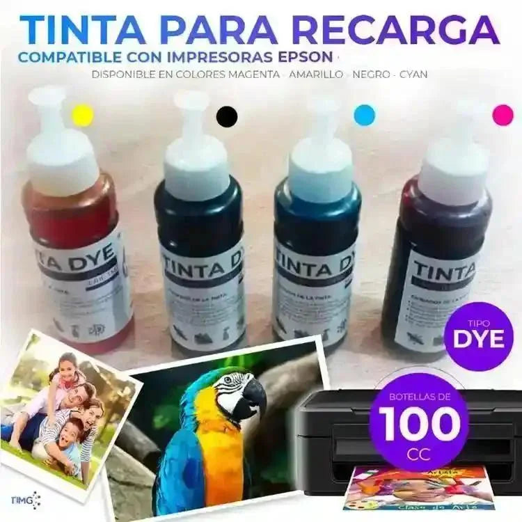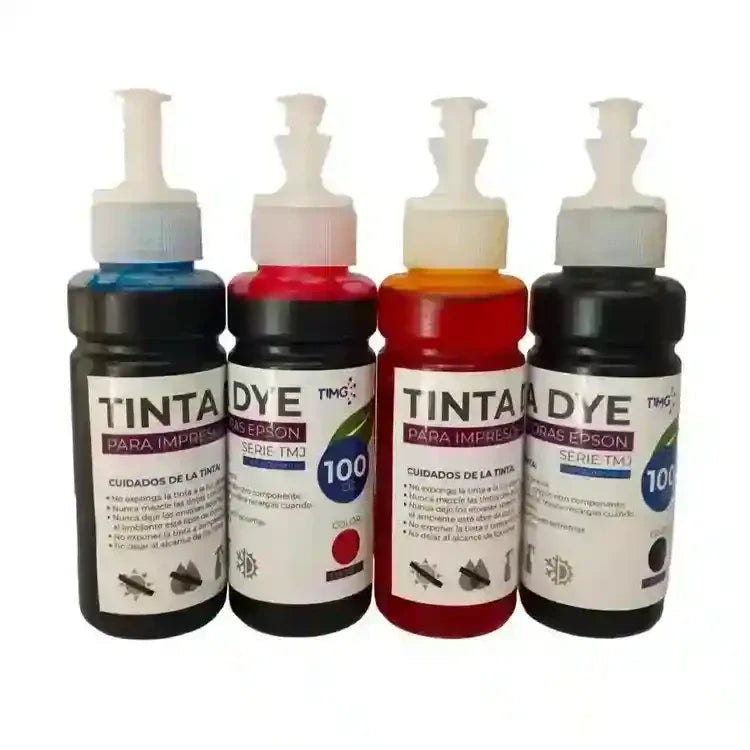 Nuestra tinta alternativa dye es ideal para aquellos que buscan una opción económica y eficiente para recargar sus impresoras Epson. Disponible en los colores esenciales CMYK (Cyan, Magenta, Negro y Amarillo), esta tinta asegura una reproducción precisa y vibrante de tus documentos y fotografías.